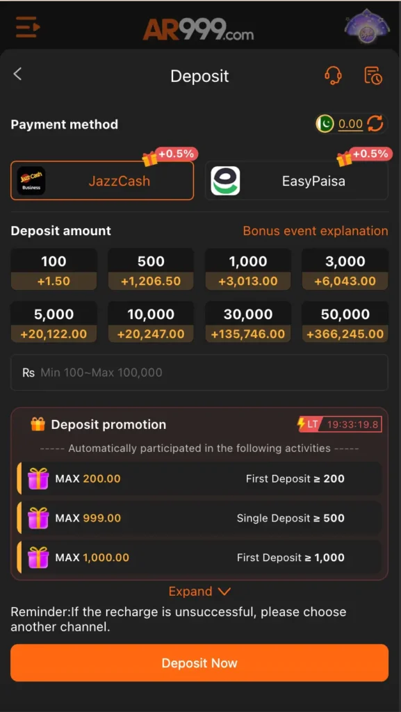 The Ar999 Game APK simplifies financial management by processing all deposits and withdrawals directly through the in-app Wallet section. You simply choose a preferred local provider, such as EasyPaisa or JazzCash, to complete your transaction. By using official gateways, the app ensures that every transfer remains secure, fast, and safe.
